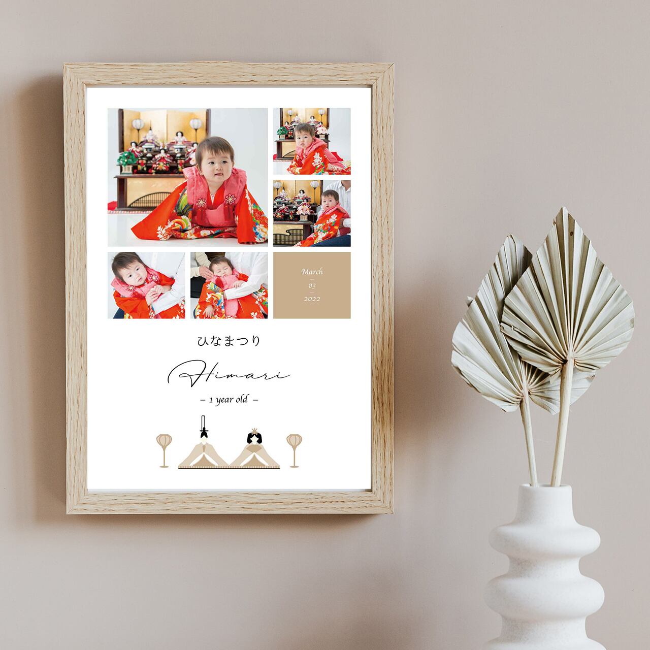 雛人形と一緒に写るお気に入りの1枚は大きく、その他、お子さまのさまざまな表情のお写真を4枚、グリッド状にレイアウト。